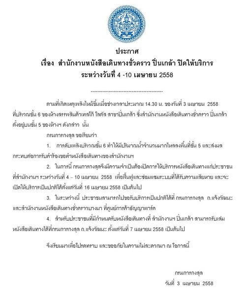 ประกาศเรื่อง สำนักงานหนังสือเดินทางชั่วคราว ปิ่นเกล้า ปิดให้บริการระหว่างวันที่ 4 -10 เมษายน2558