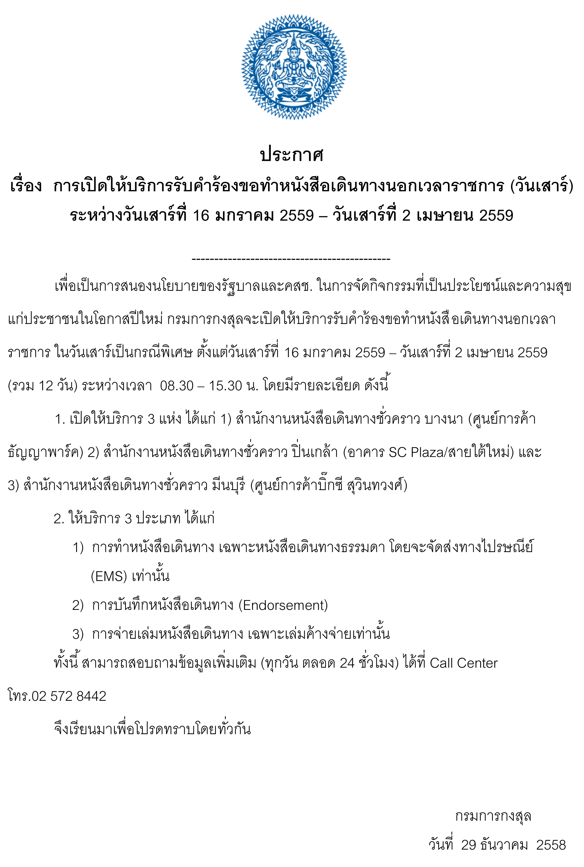การเปิดให้บริการรับคำร้องขอทำหนังสือเดินทางนอกเวลาราชการ (วันเสาร์) ระหว่างวันเสาร์ 16 มกราคม - 2 เมษายน 2559
