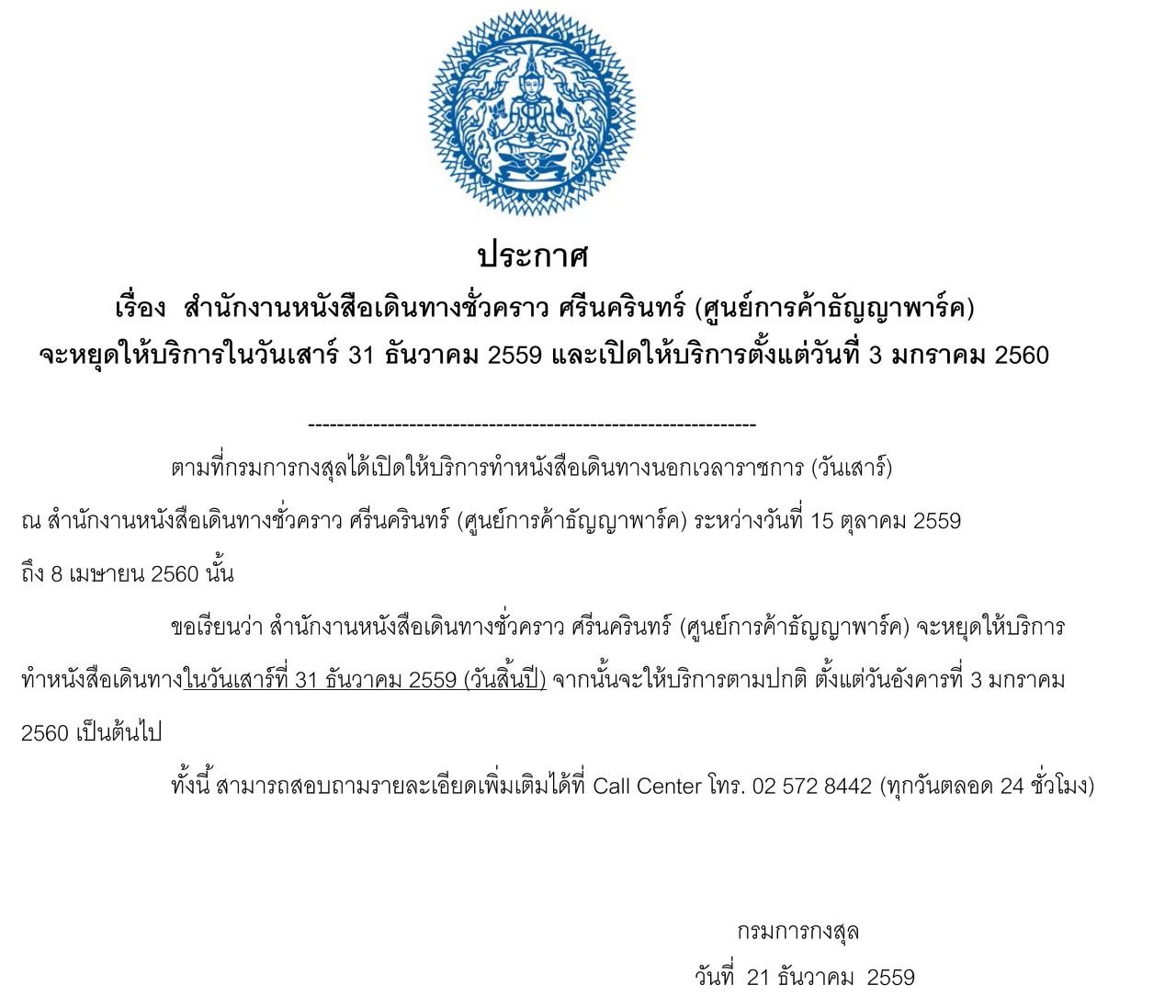 สำนักงานหนังสือเดินทางชั่วคราว ศรีนครินทร์ (ศูนย์การค้าธัญญาพาร์ค) จะหยุดให้บริการในวันเสาร์ 31 ธันวาคม 2559 และเปิดให้บริการตั้งแต่วันที่ 3 มกราคม 2560