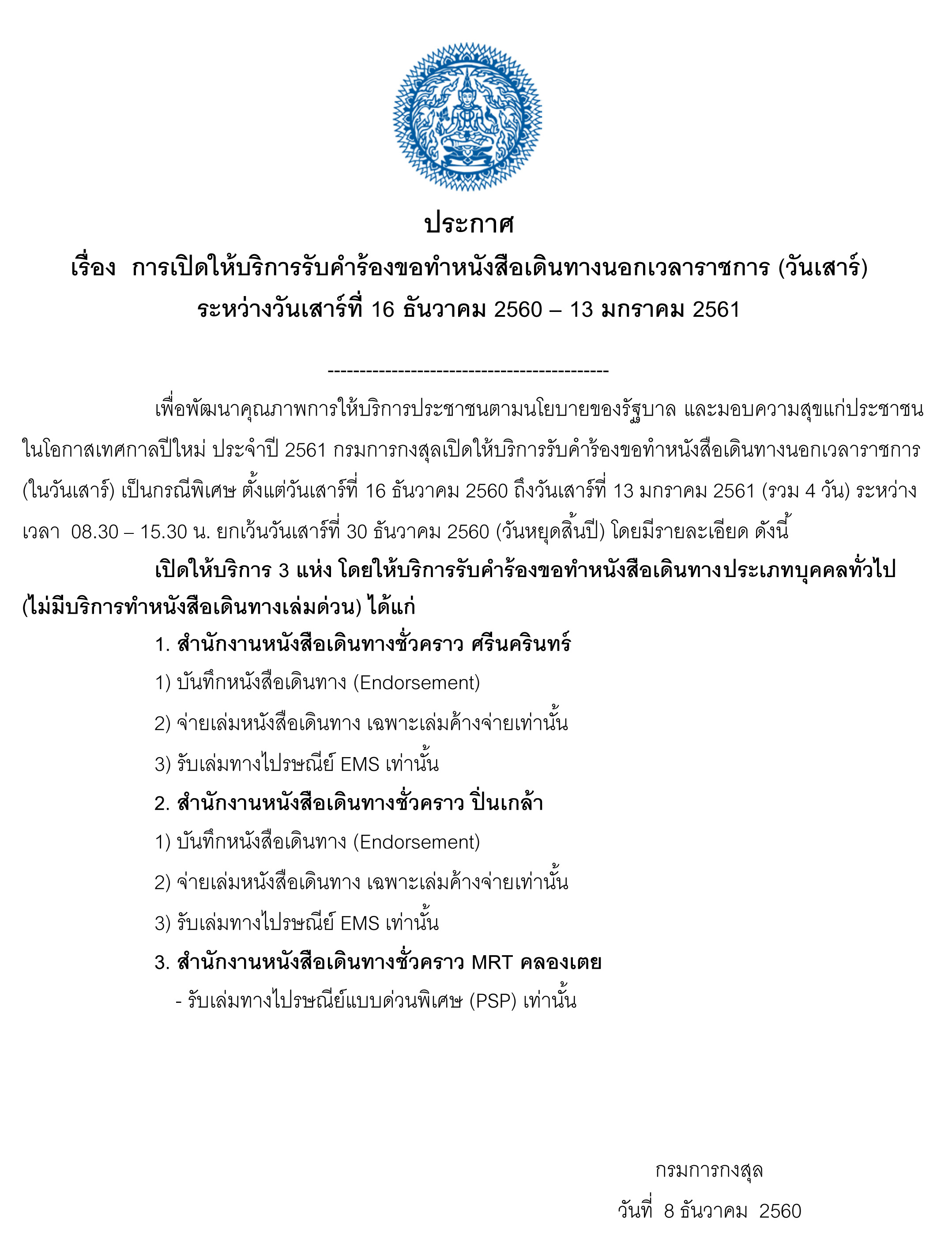 ประกาศกรมการกงสุล เรื่องการเปิดให้บริการรับคำร้องขอทำหนังสือเดินทางนอกเวลาราชการ (ในวันเสาร์) เป็นกรณีพิเศษ